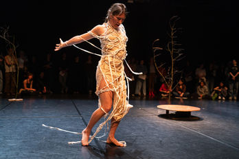 In my movement research, I draw inspiration from the rhythmic patterns found in nature, while also delving into movements that symbolize liberation from enclosure. The pulsing movement of the chest emerges as a central point, serving as both an outlet for expression and a hub of connection. Throughout the performance the cyclical character of movement is felt, which is symbolized by a centrally rotating small platform. The continuous flow of life, an echo of the constant rhythms of nature.